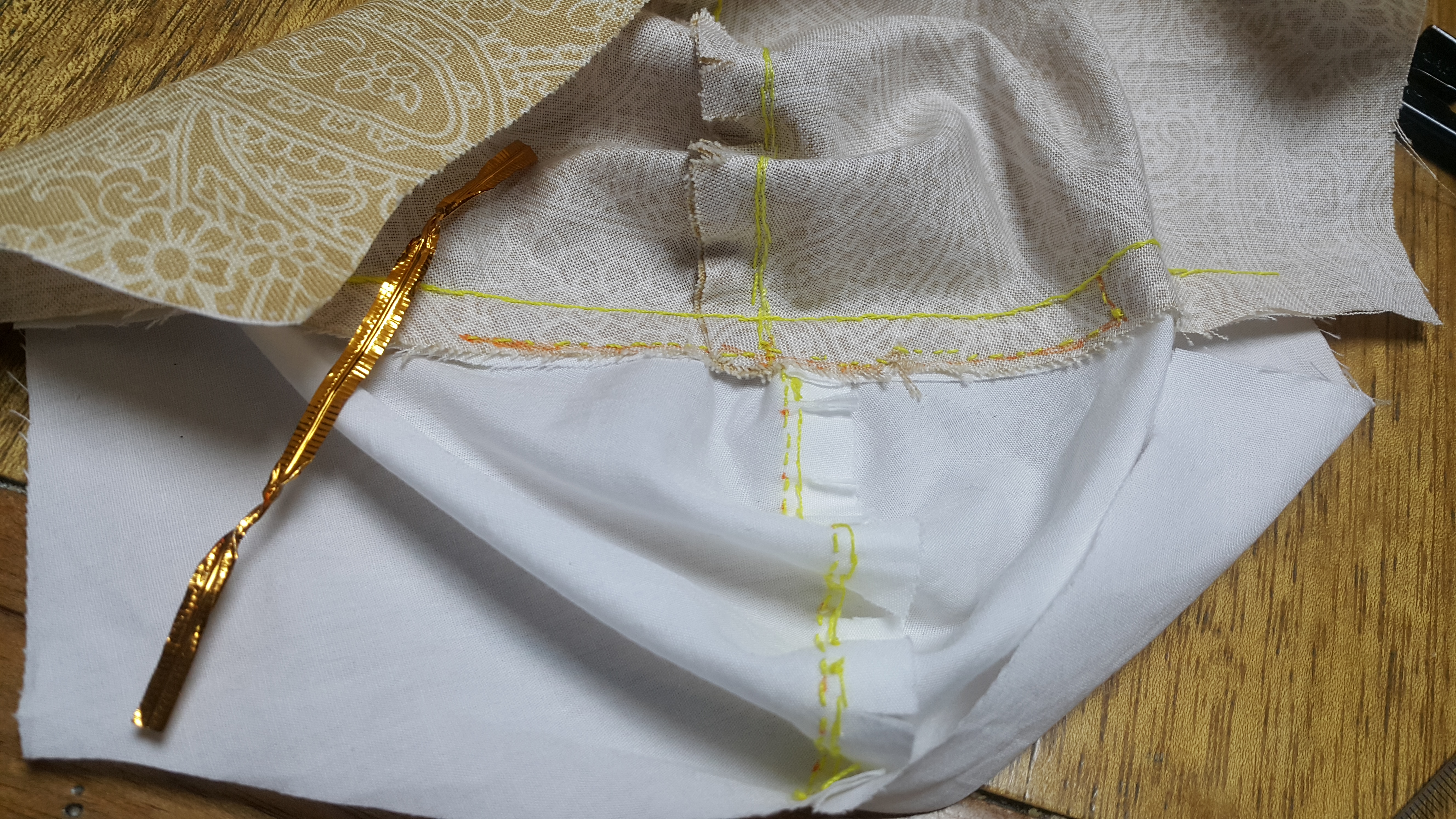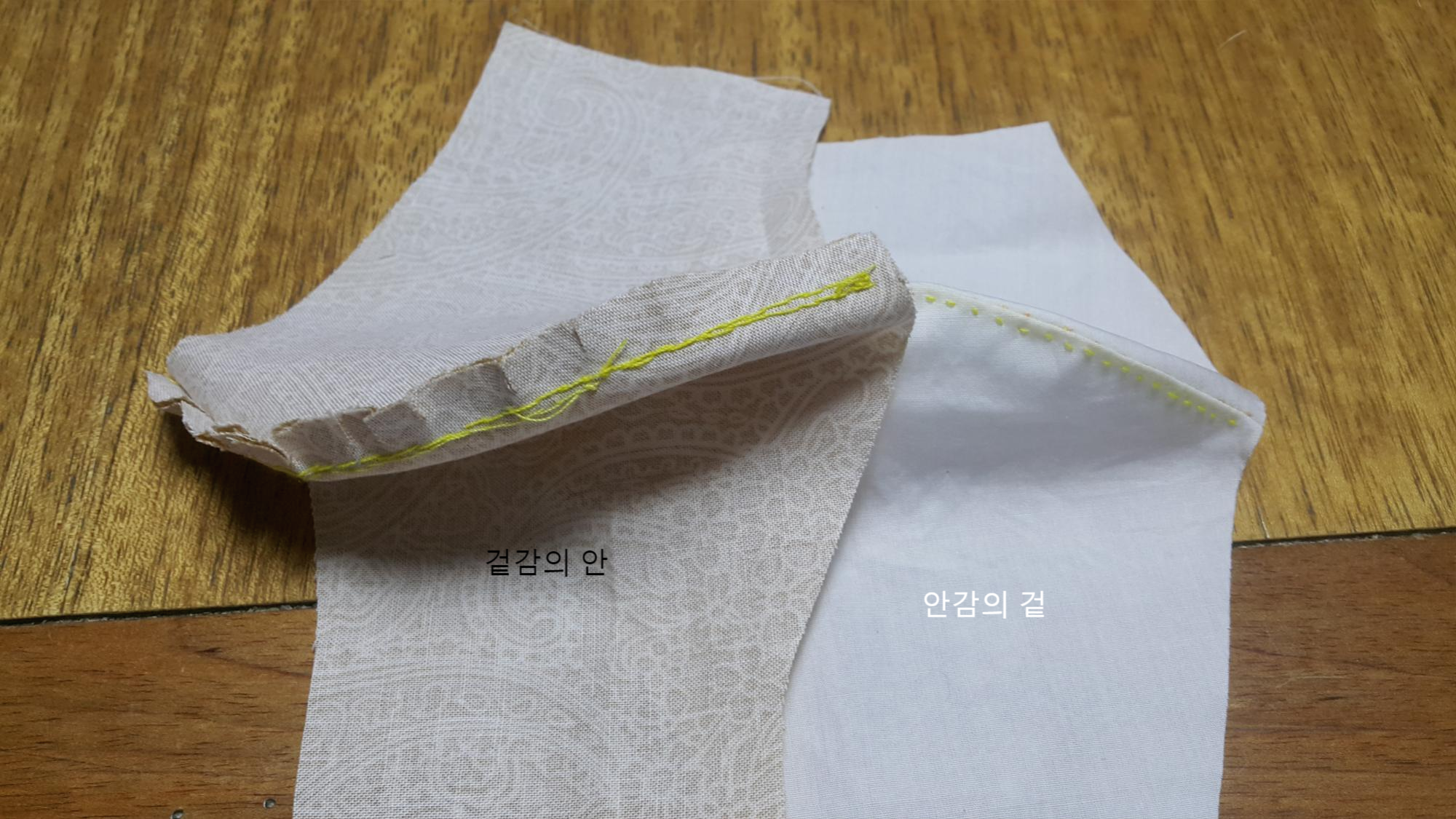 5. 안감의 겉과 겉감의 겉을 마주보게 두면 아래 사진처럼 보입니다. 코 닿는 위부분을 바느질합니다.