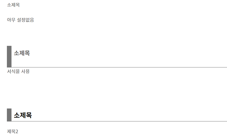 설정없는 글자와 서직으로 불러와서 제목을 다시 쓴 것과 블럭지정해서 제목설정만 해준 것입니다.