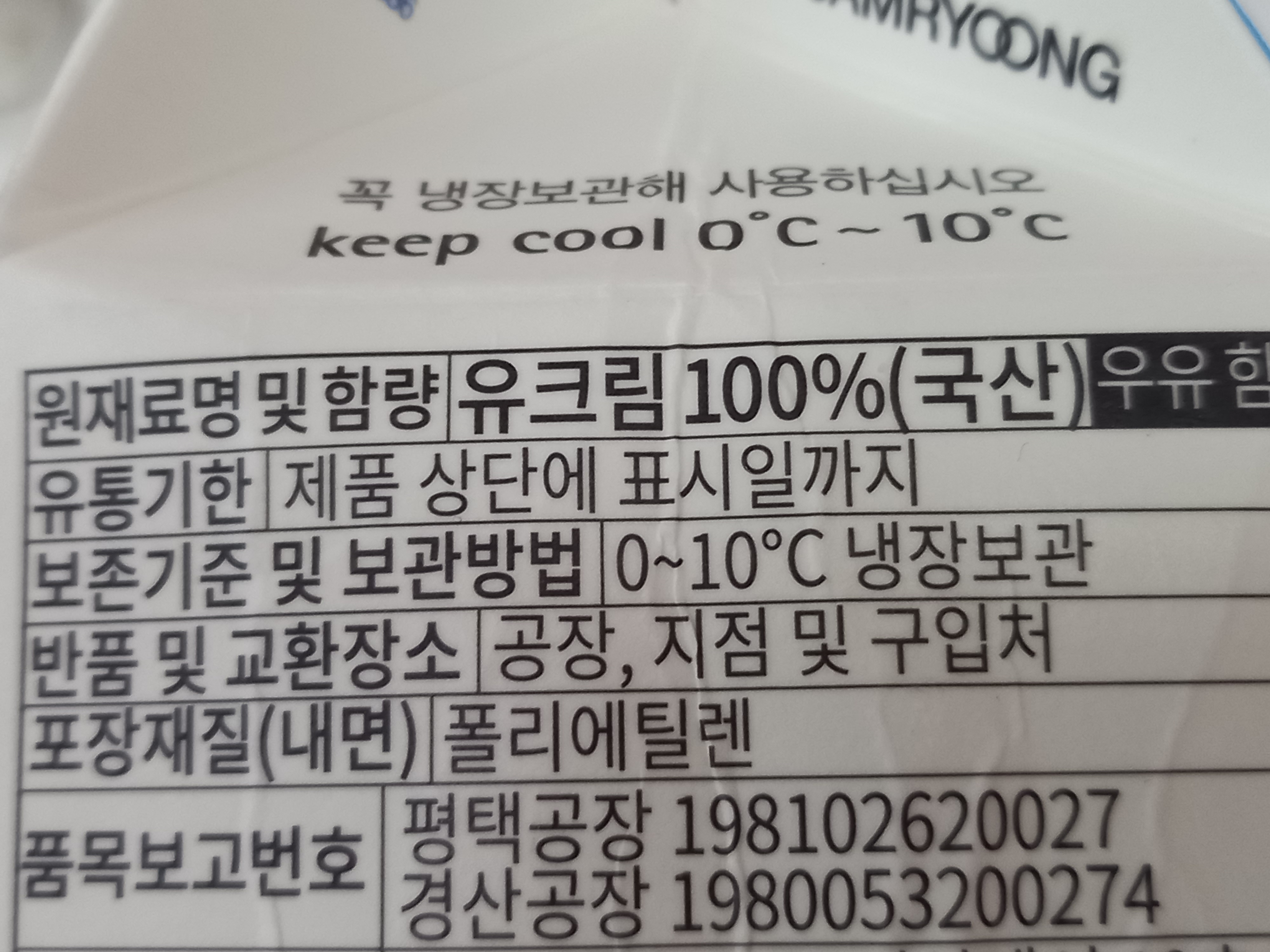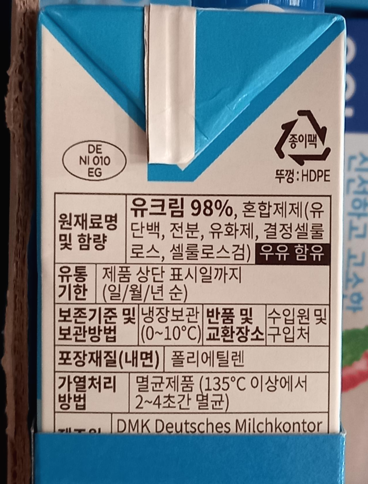 성분표를 보면 유크림(96%), 산도조절제, 유화제, 산탄검 등이 포함되어 있습니다.