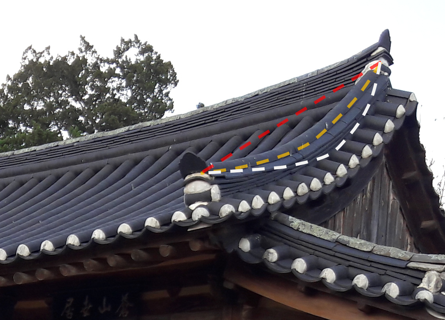 한옥의 지붕 모양이 옆에서 보면 직선이 아니고 곡선입니다. 이유는 빗방울이 지붕에 오래 머물러 있으면 스며들수가 있어 지붕에 빗방울이 머무르는 시간이 짧을수록 좋기 때문입니다.