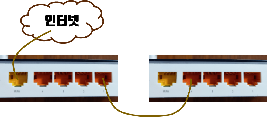 인터넷 회사에서 제공한 선을 WAN에 꽂고 여기서 나온 LAN에서 허브로 사용할 공유기의 LAN 포트로 선을 연결해야 합니다.