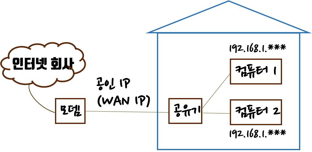 인터넷 회사에서 공인IP를 공유기가 여러개의 가상 IP로 192.168.1.***에서 마지막 ***에 다른 주소로 구별을 합니다.