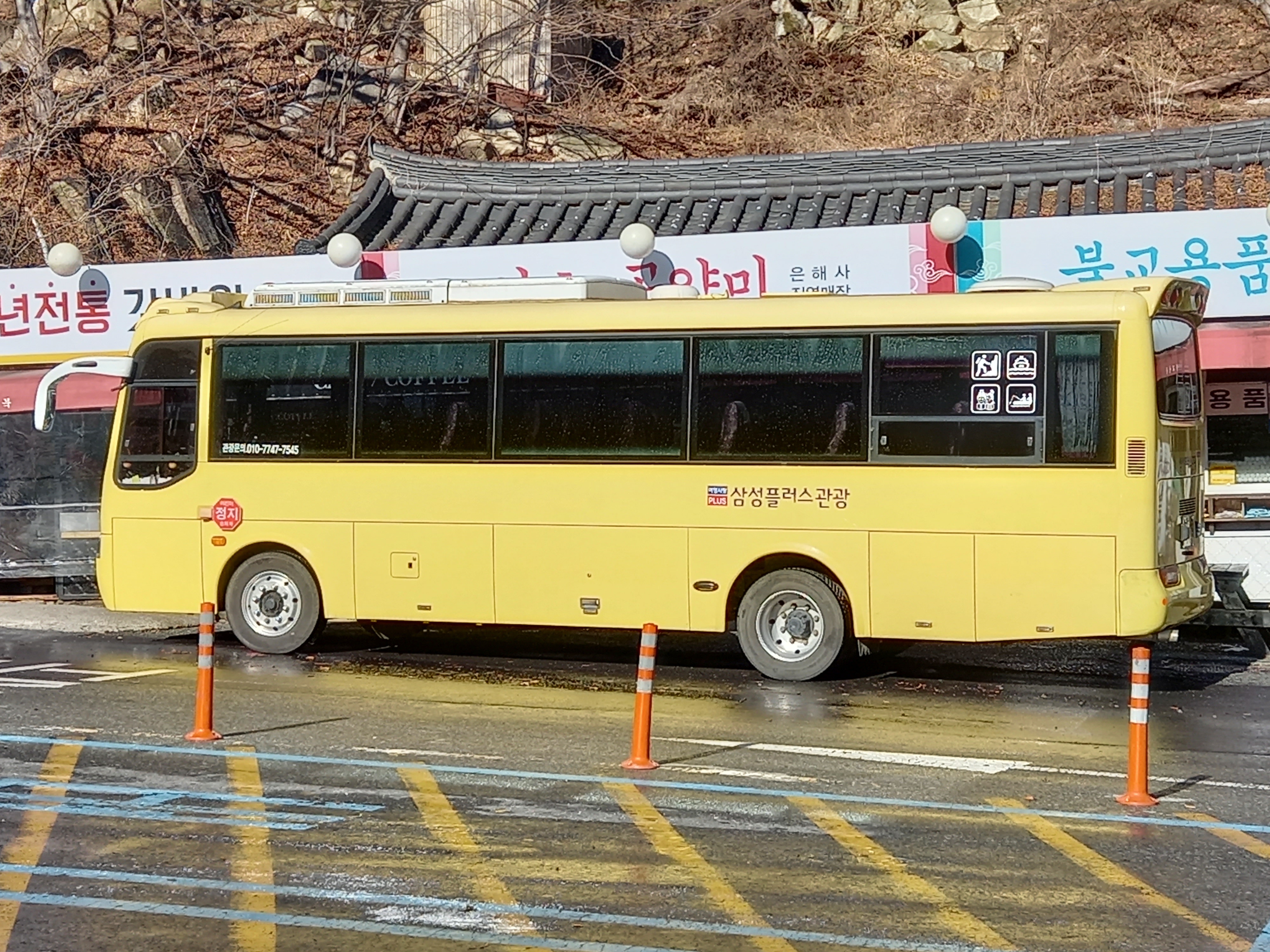 관음휴게소가 제법 넗어 어디서 무료 셔틀 버스를 타는지 몰라 헤매어서 버스 종점에 도착한 셔틀버스를 찍어 보았습니다. 휴게소에서 노란 큰 버스가 정지해 있는 부근으로 가시면 양초 판매소가 있습니다.