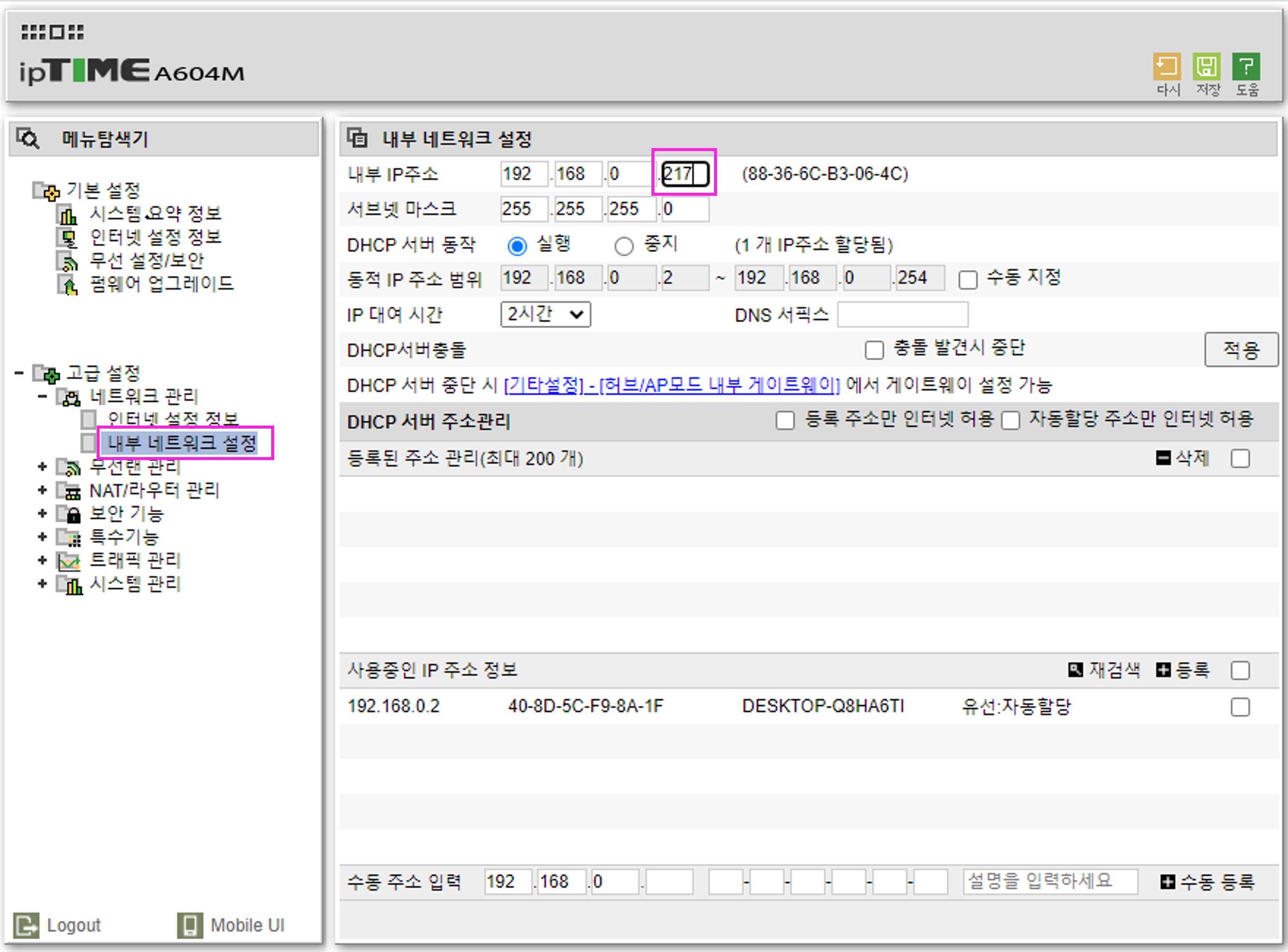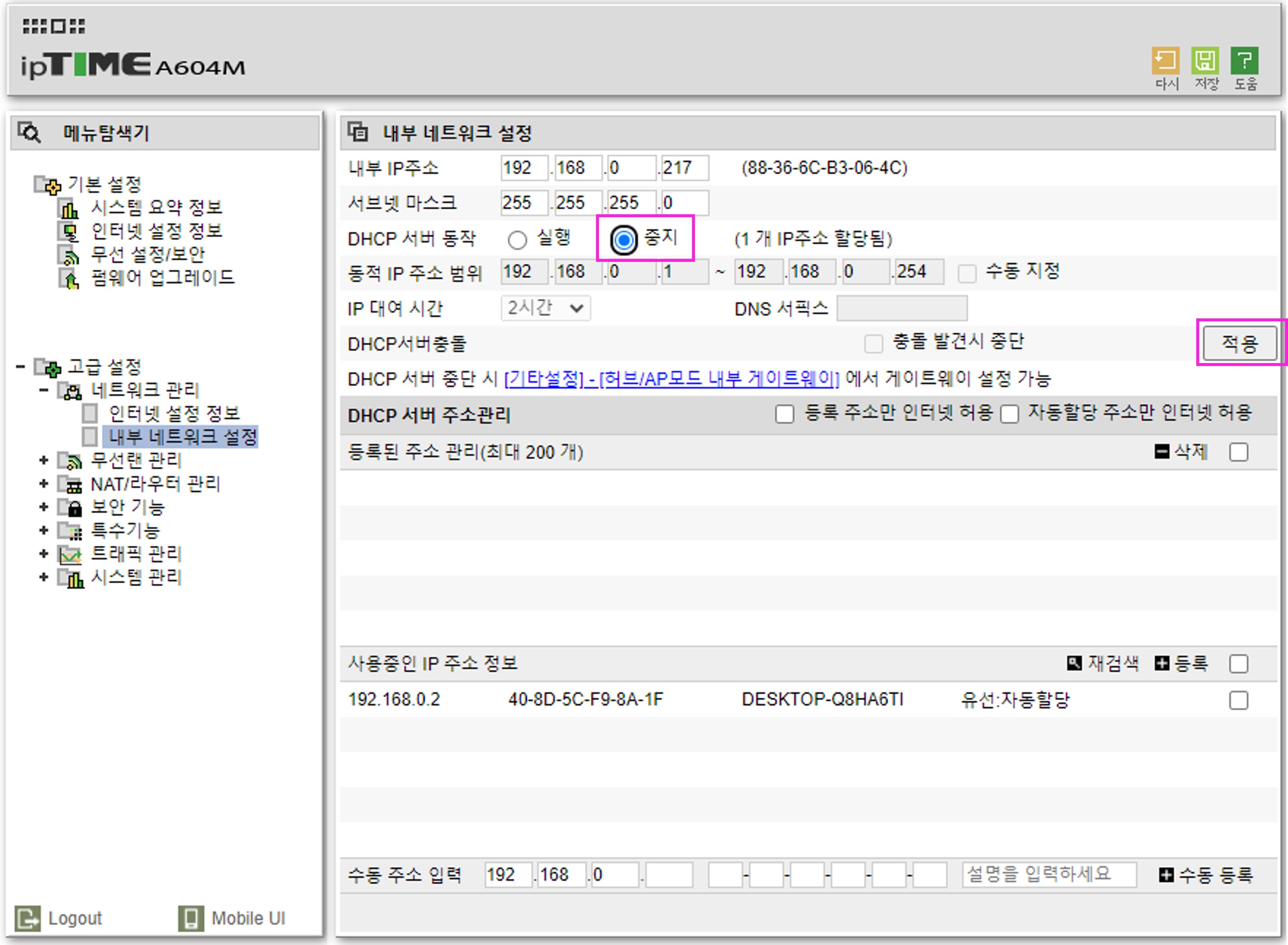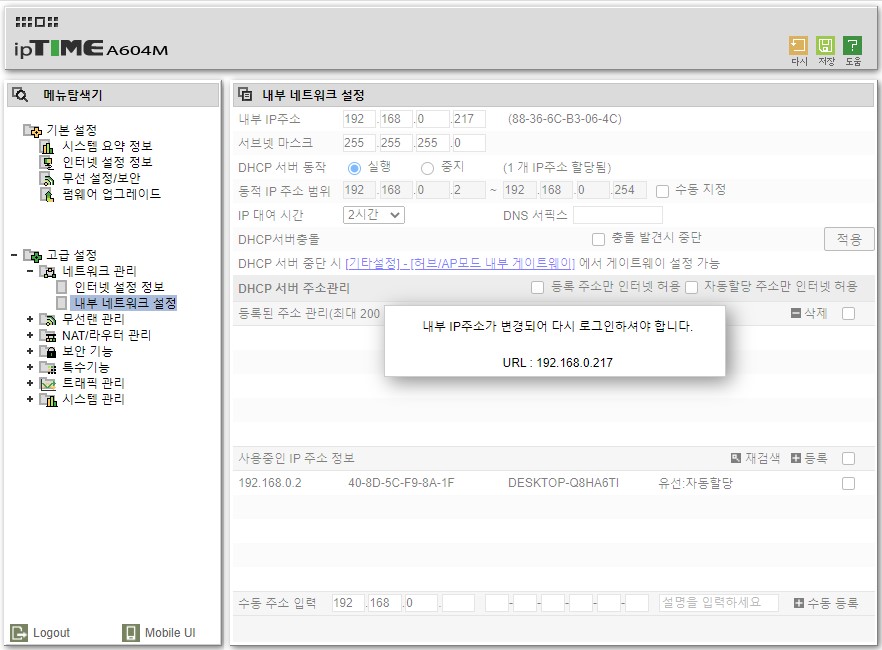 4. [관리도구] - [고급설정] - [네트워크관리] - [내부네트워크 설정]을 클릭하고, 내부IP주소의 끝자리를 가장 사용하지 않을법한 번호 (예를들어 217)로 바꾸어 입력합니다. [적용 후 시스템 다시 시작] 버튼을 클릭합니다.