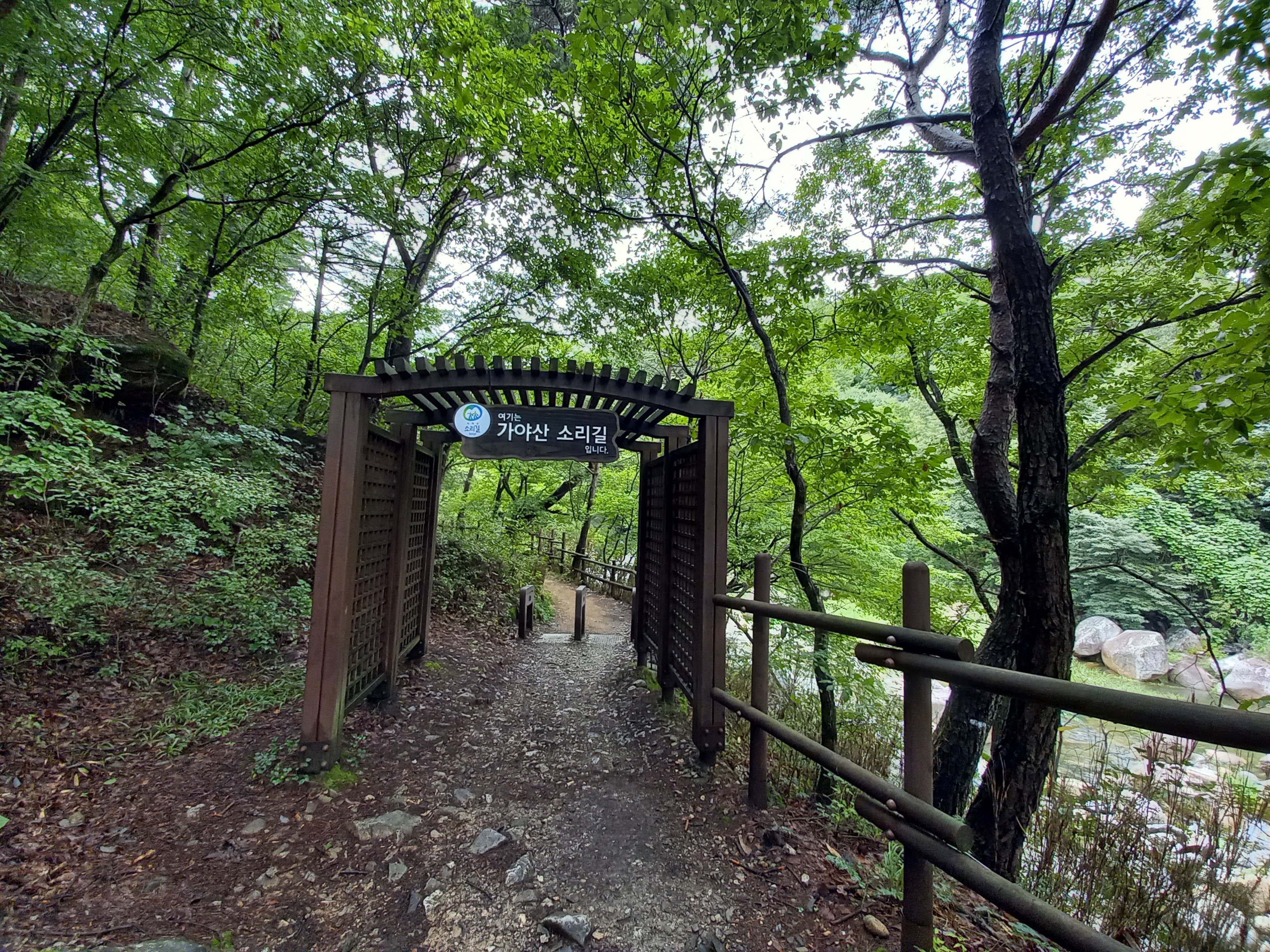 해인사로 올라가다 보면 대장경테마파크가 보이고 많은 분들이 그곳에 주차를 하시는데 소리길 입구까지 1킬로미터 계곡을 따라 걸을 수 있습니다. 계곡을 따라 걷는 길이라 좋긴하지만 나무가 거의 없어 여름에는 썩 좋은 길은 아닙니다.