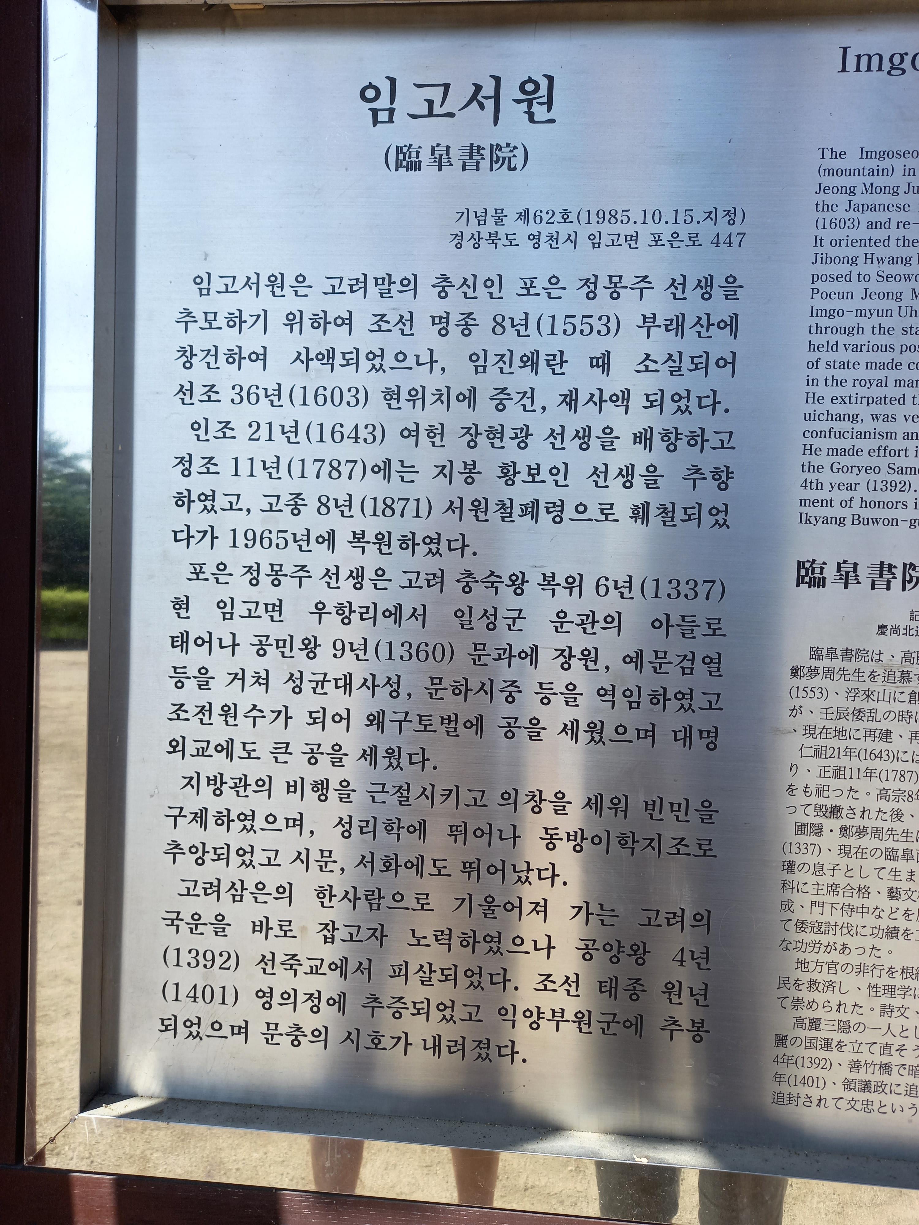 임고서원이 있다는 것은 알고 있었지만 정몽주 선생을 모신 사당이 있다는 것은 처음 알게 되었습니다. 정몽주 선생을 생각하면 개성 부근의 사람일거라는 막연한 생각을 하고 있었는데 영천에서 태어나 자라신 분이라고 하네요.