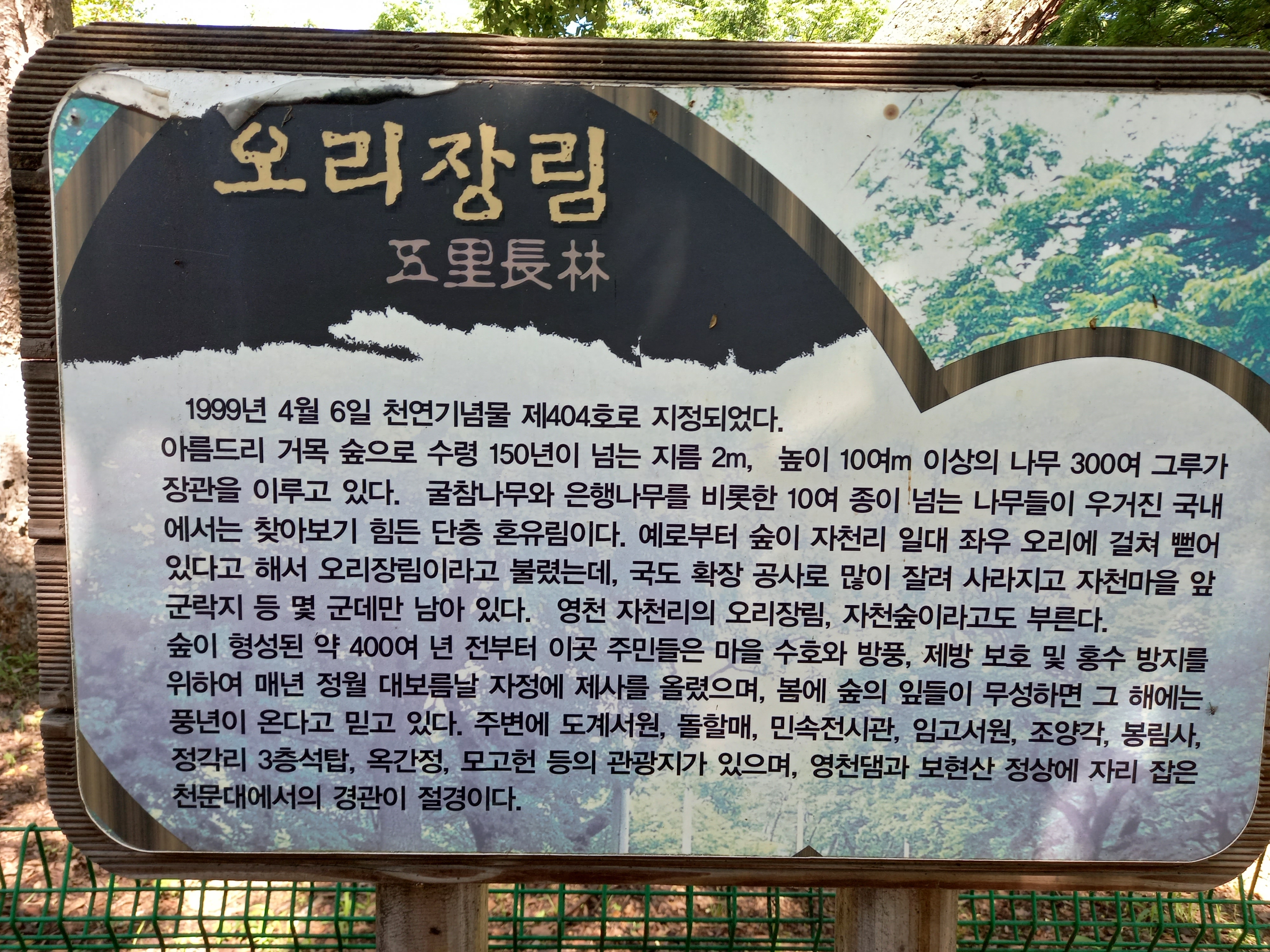 임고서원 옆의 단심로를 걸을까 고민하다가 주변에 오리나 되는 숲이 있다고 해서 오리장림으로 향했습니다. 하지만 원래는 숲이 우거져 있었지만 길이 새로 나면서 길가의 몇그루 나무만 있는 작은 숲이라 단심로를 걸을 걸 하는 후회를 잠깐 했습니다.